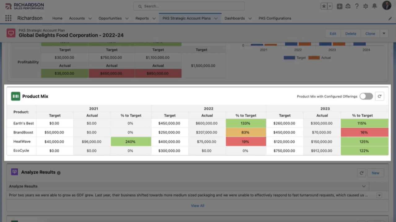 - Account Performance: Analyze account revenue year over year to determine additional opportunities to reach revenue targets