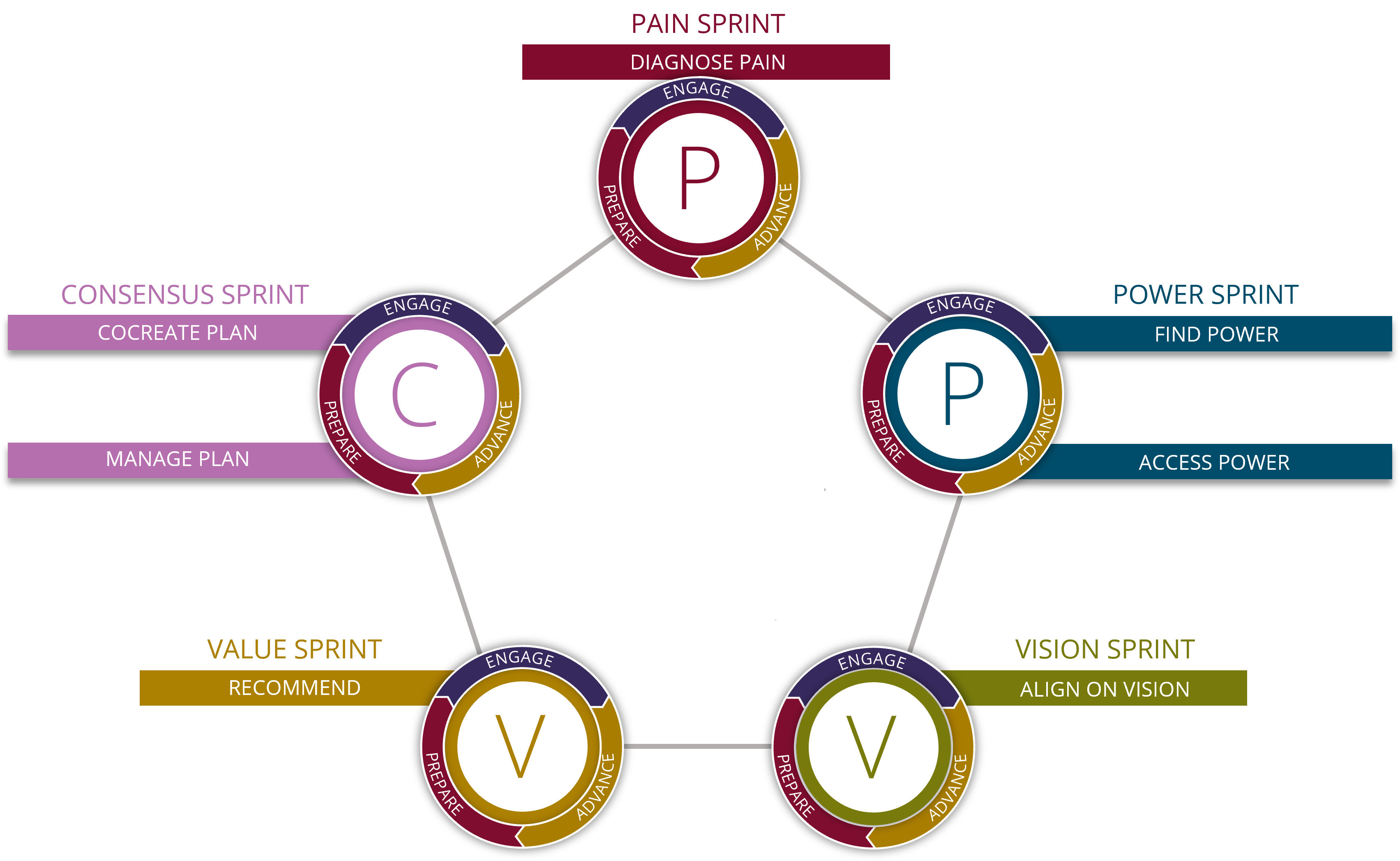 The Opportunity Vitals are pain, power, vision, value, and consensus.
